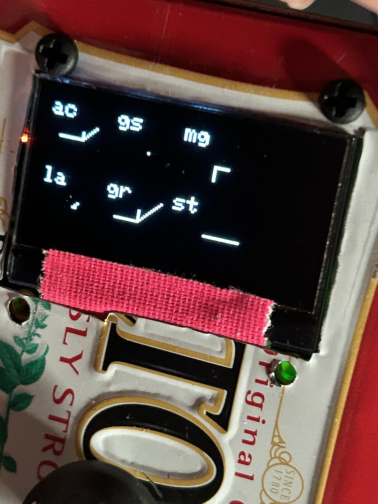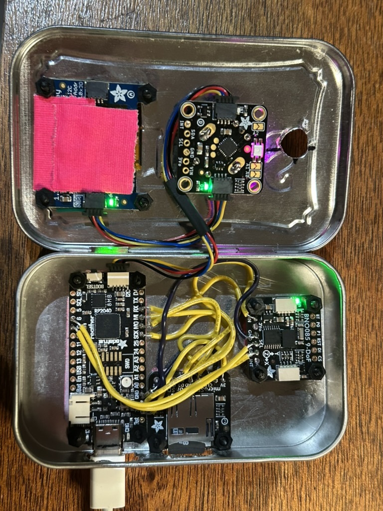 on the top of the tin is: an oled display, a power button/switch, and rotary encoder knob (also has a push button) for ui stuff. inside is a adafruit feather rp2040, the bno08x sensor, a battery (not in the picture below), a sd card for sensor logz, and a real time clock.